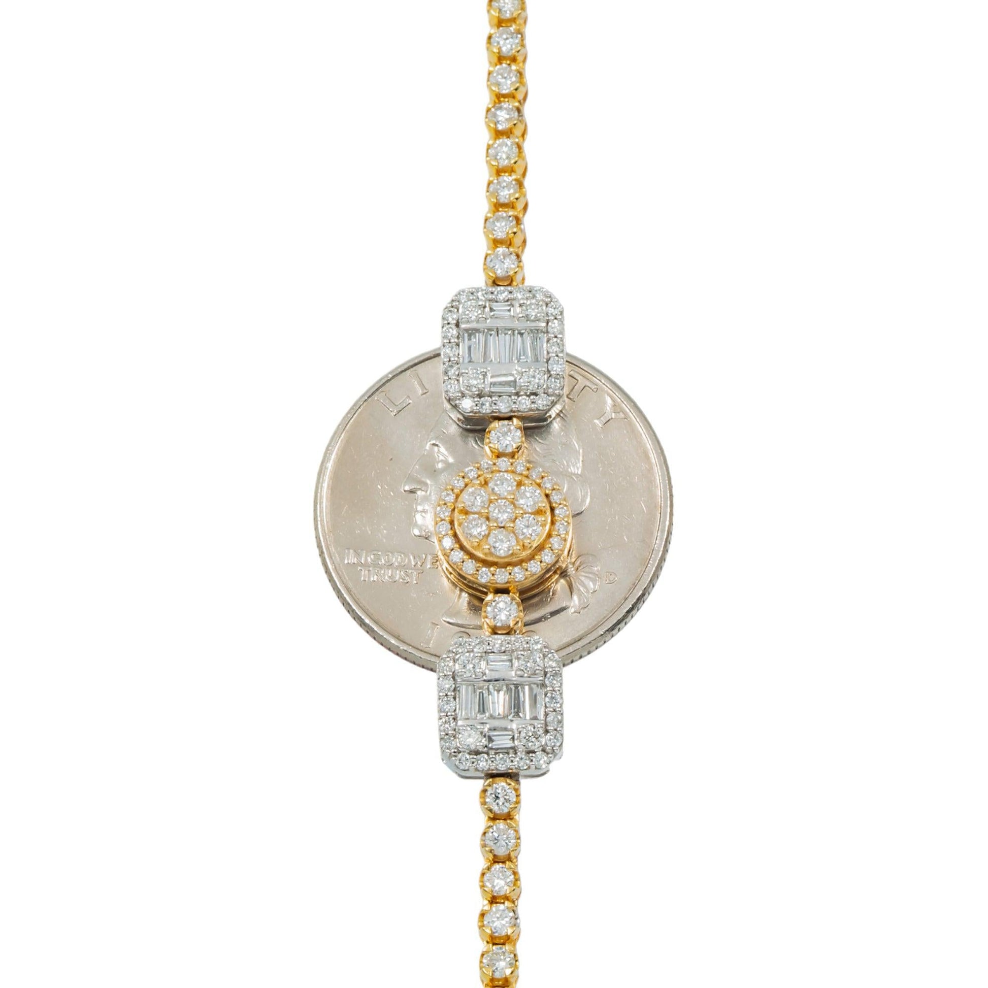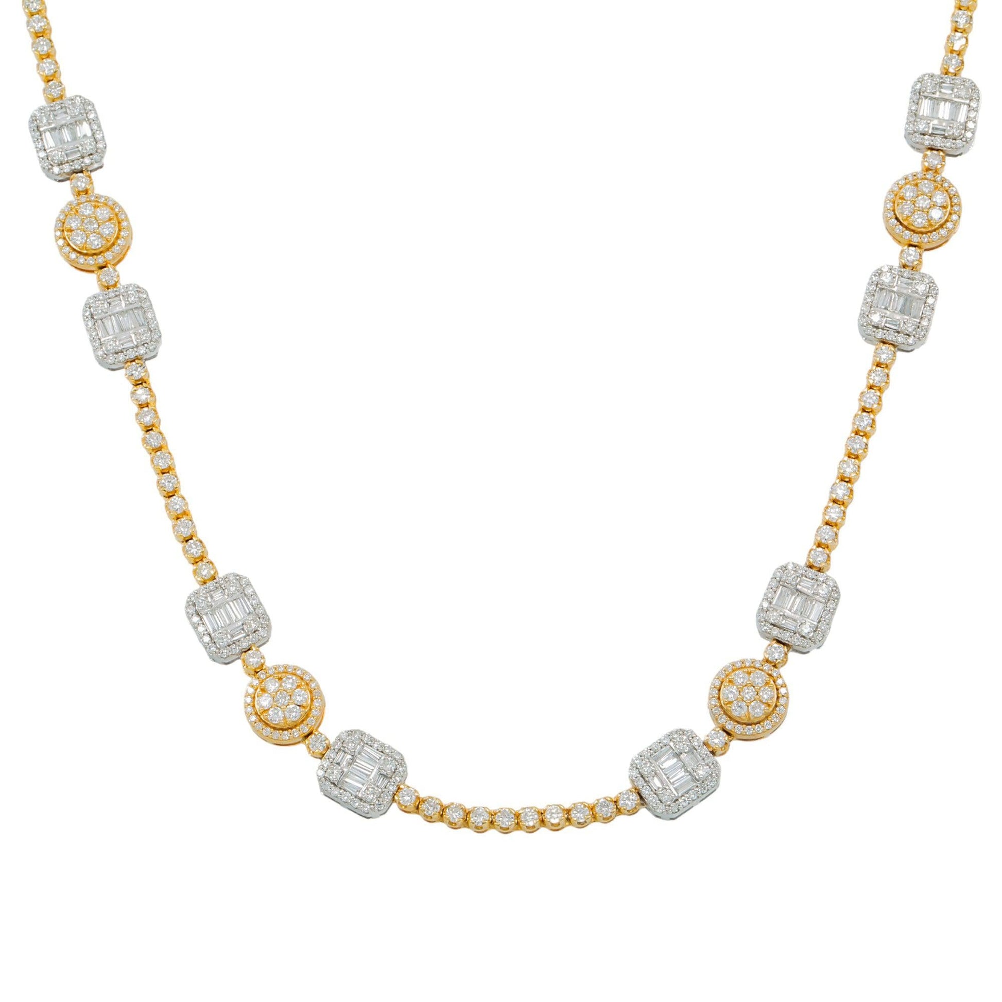 10K GOLD TWO TONE BAGUETTE AND ROUND CLUSTER DIAMOND SQUARE AND CIRCLE SHAPED CHAIN 11.69 CT
