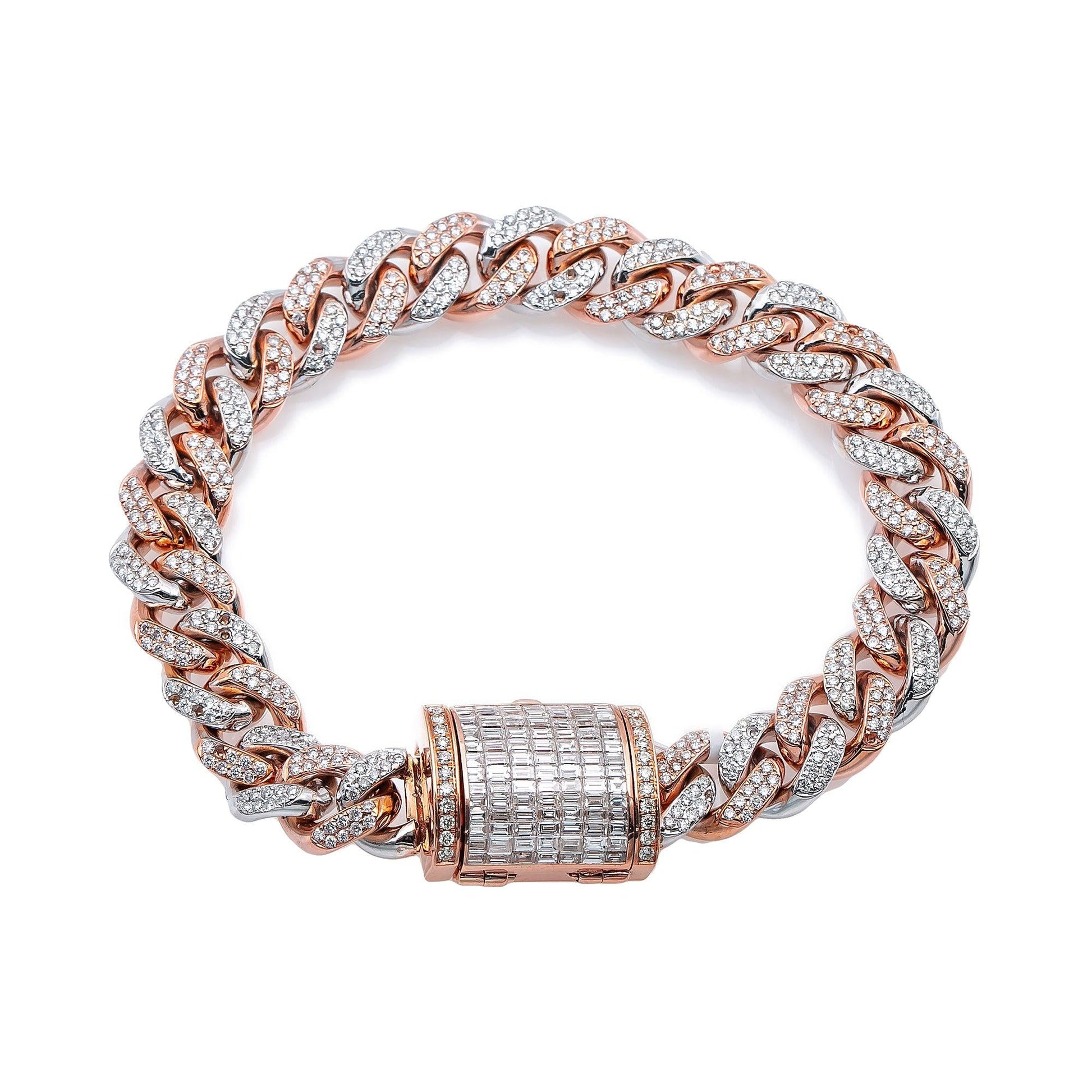 14K Two Tone Rose Gold 8.6"/10" Men's Diamond Bracelet With Baguette Diamonds Lock