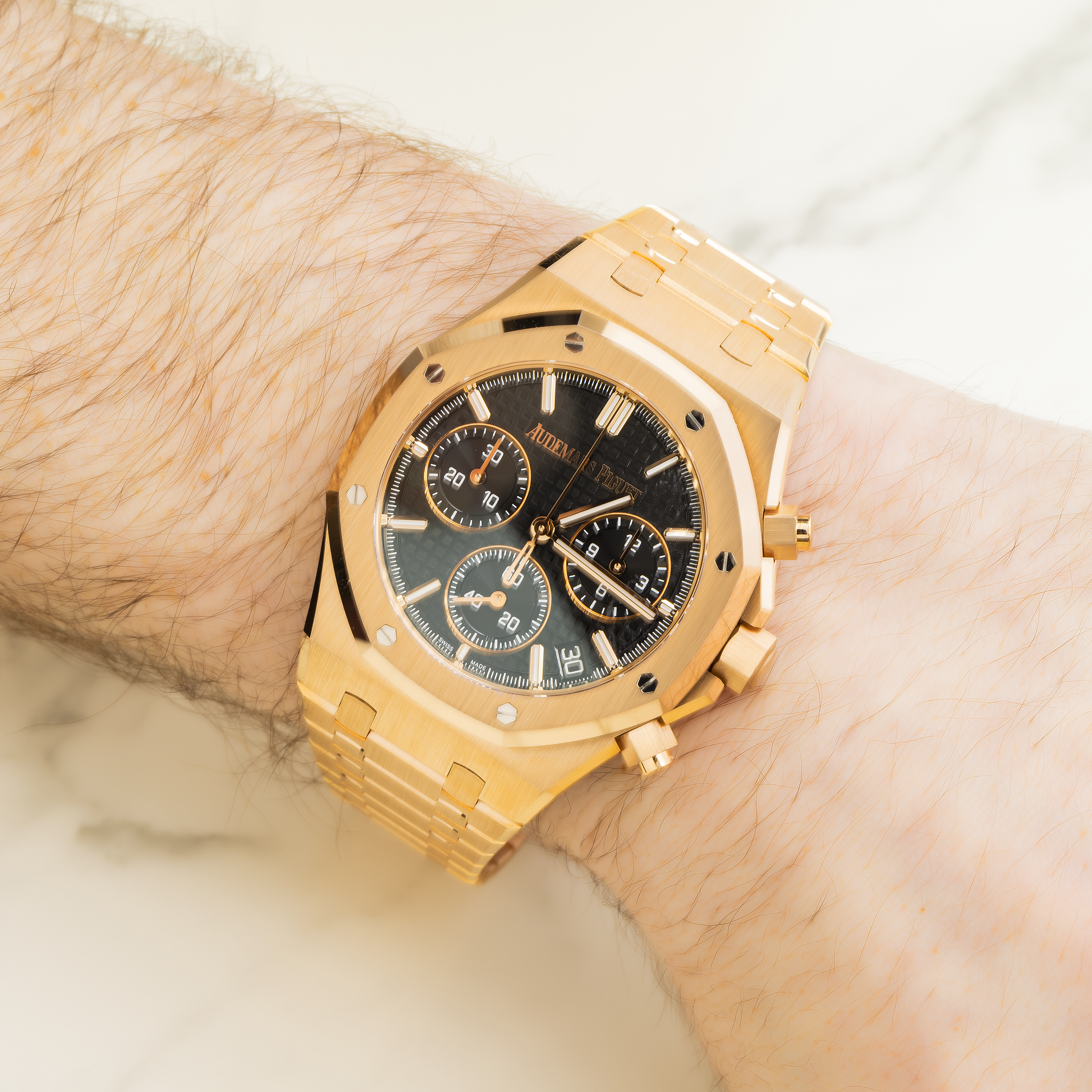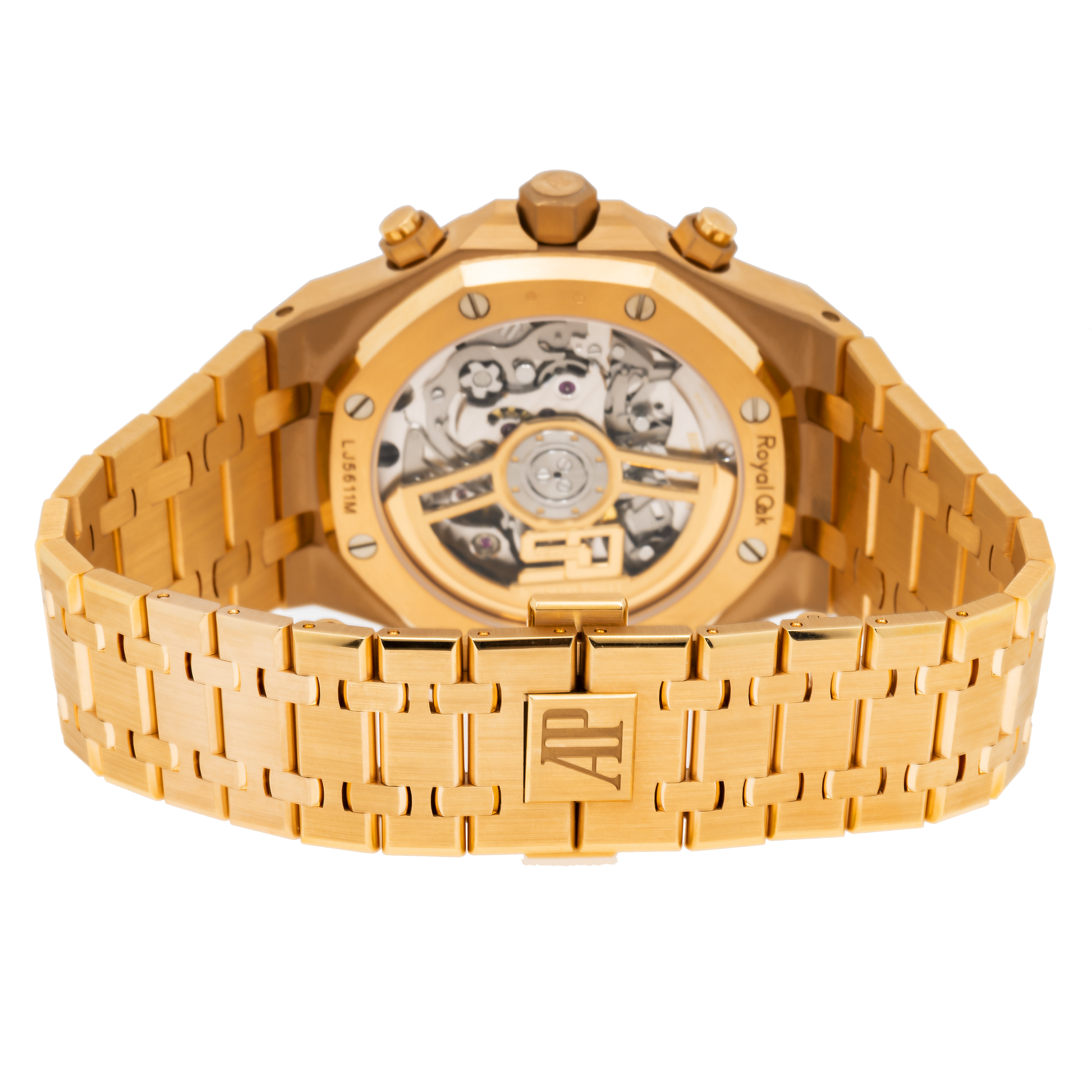 AUDEMARS PIGUET ROYAL OAK CHRONOGRAPH 26320BA 41MM BLACK DIAL WITH YELLOW GOLD BRACELET.