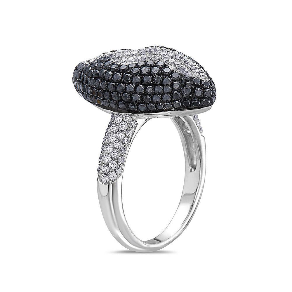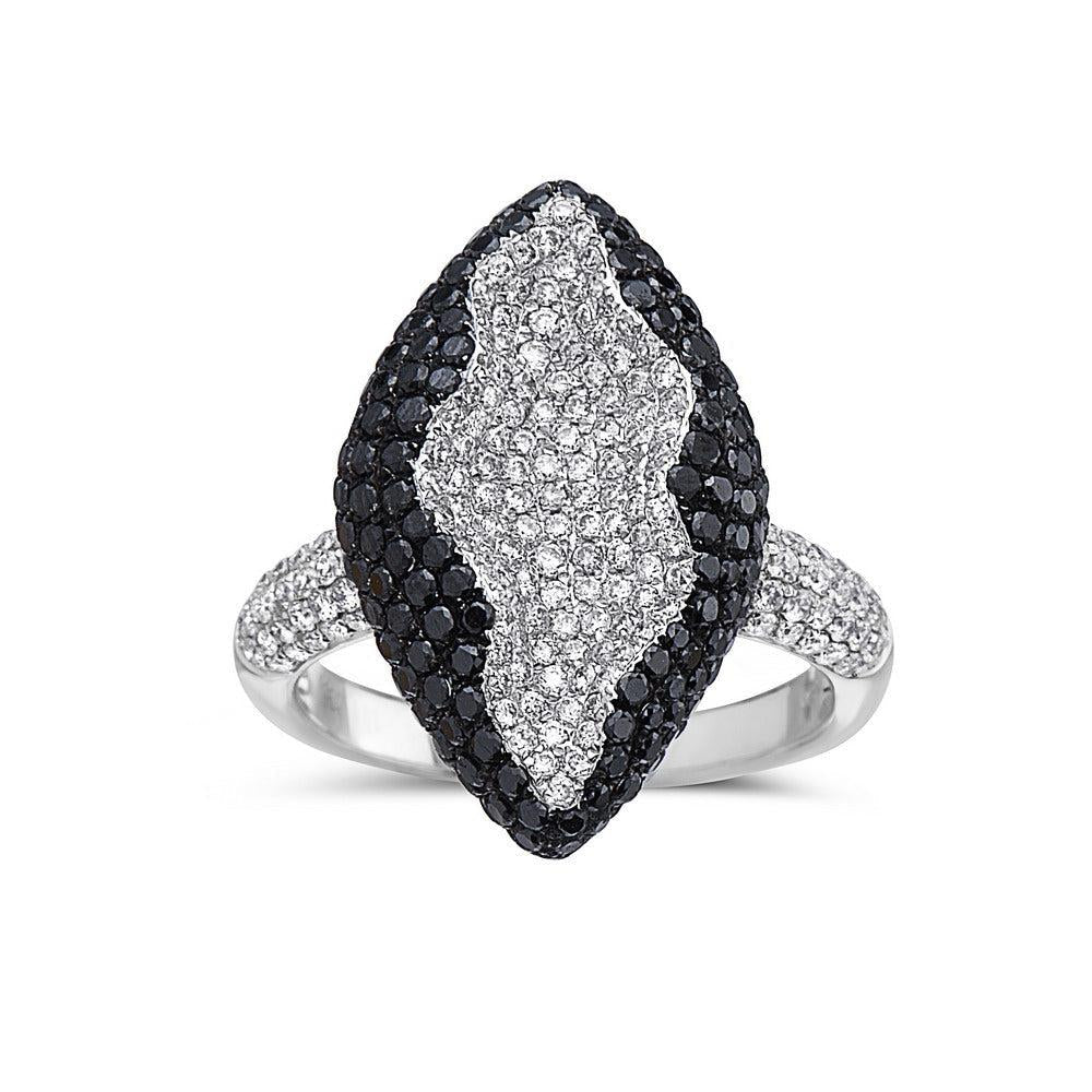 Ladies marquise shape, right hand ring. 18k white gold with brilliant and black round cut diamonds.
