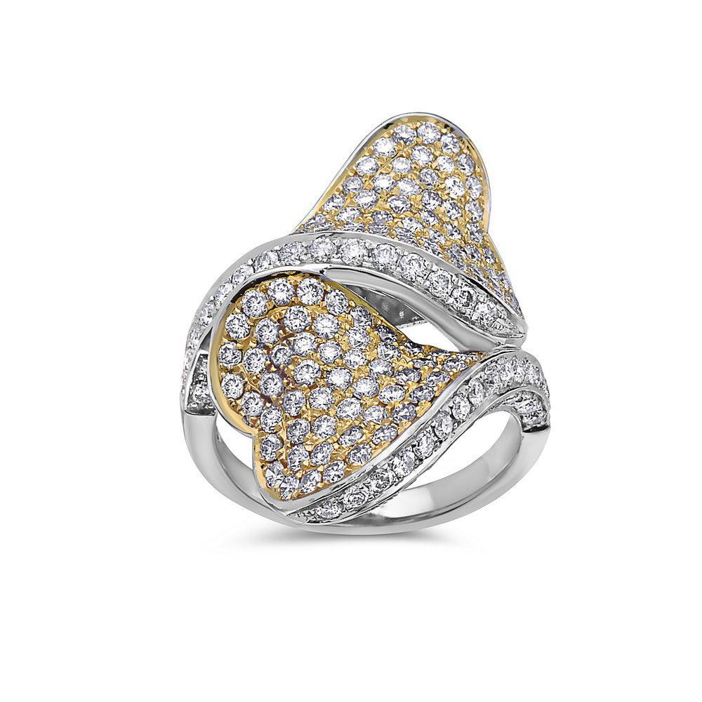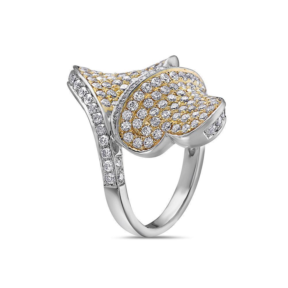 Ladies two heart shaped right hand ring. 18k white gold with brilliant round cut diamonds, as well as yellow round cut diamonds.