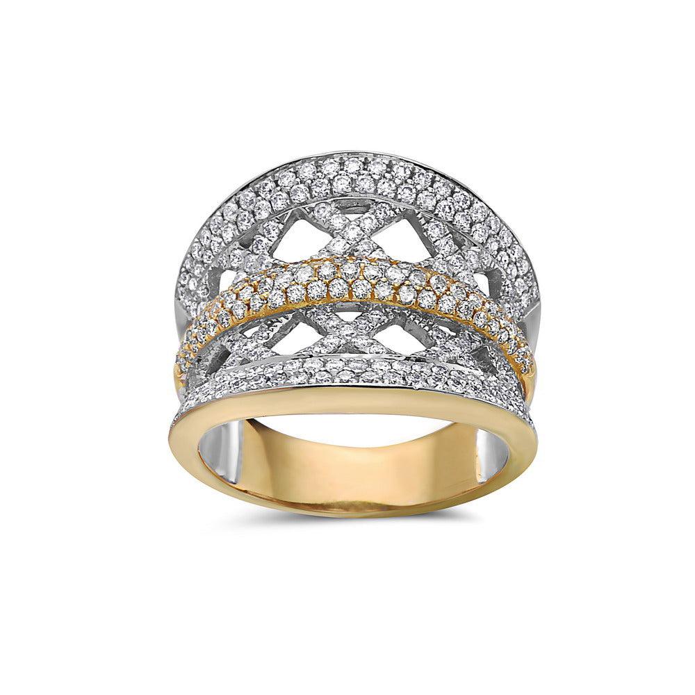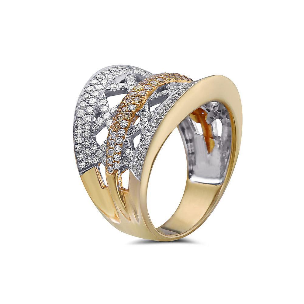 Ladies diamond right hand ring. 18k yellow gold with brilliant round cut diamonds and yellow round cut diamonds.
