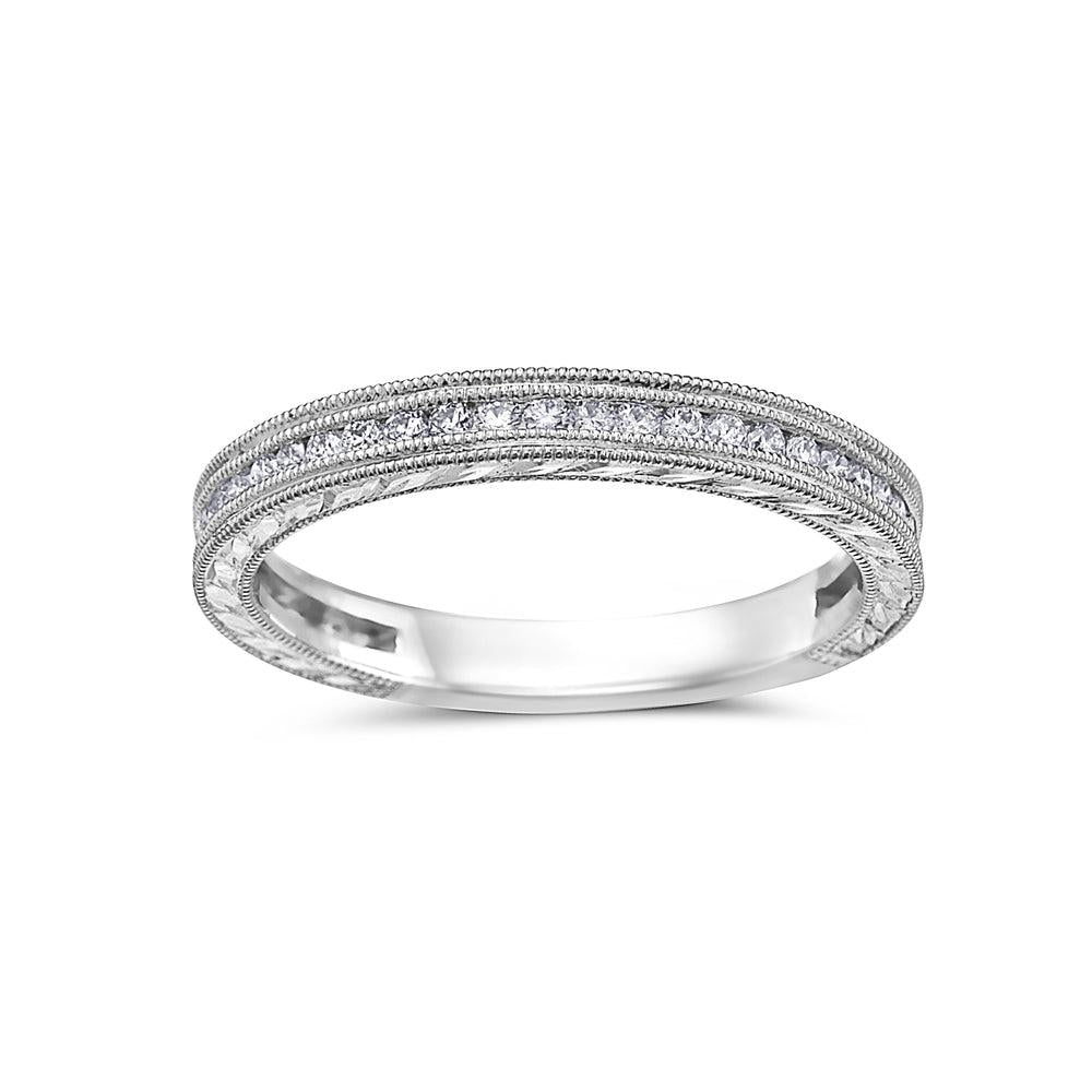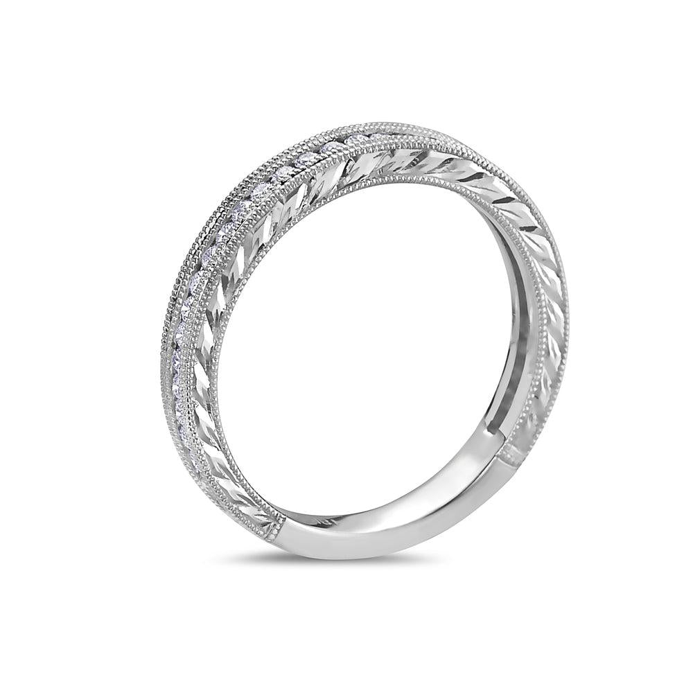Ladies 18K white gold wedding band with milligrade design and round cut diamonds.