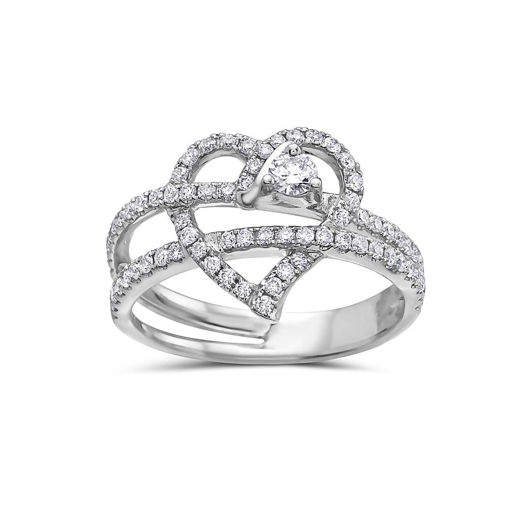 Ladies 18k white gold heart shaped right hand ring, with round cut diamonds.