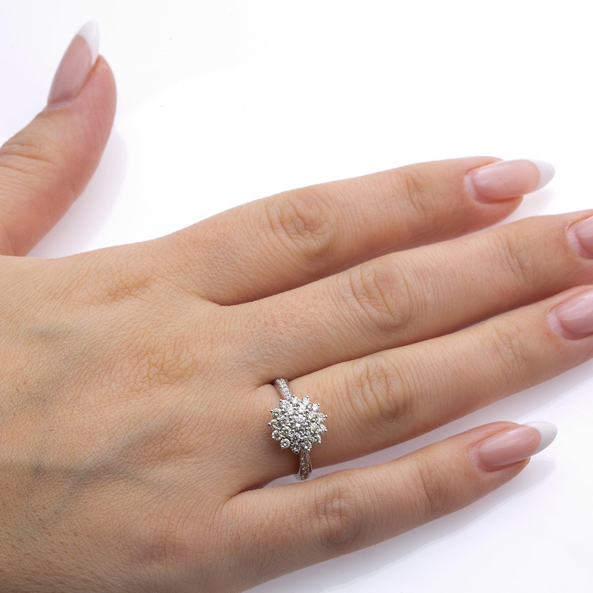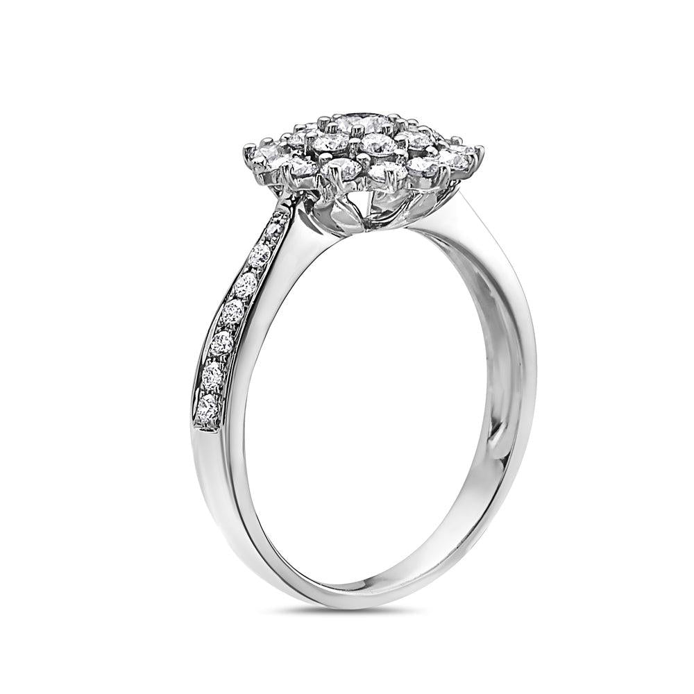 Ladies 18k white gold flower shaped right hand ring with round cut diamonds.