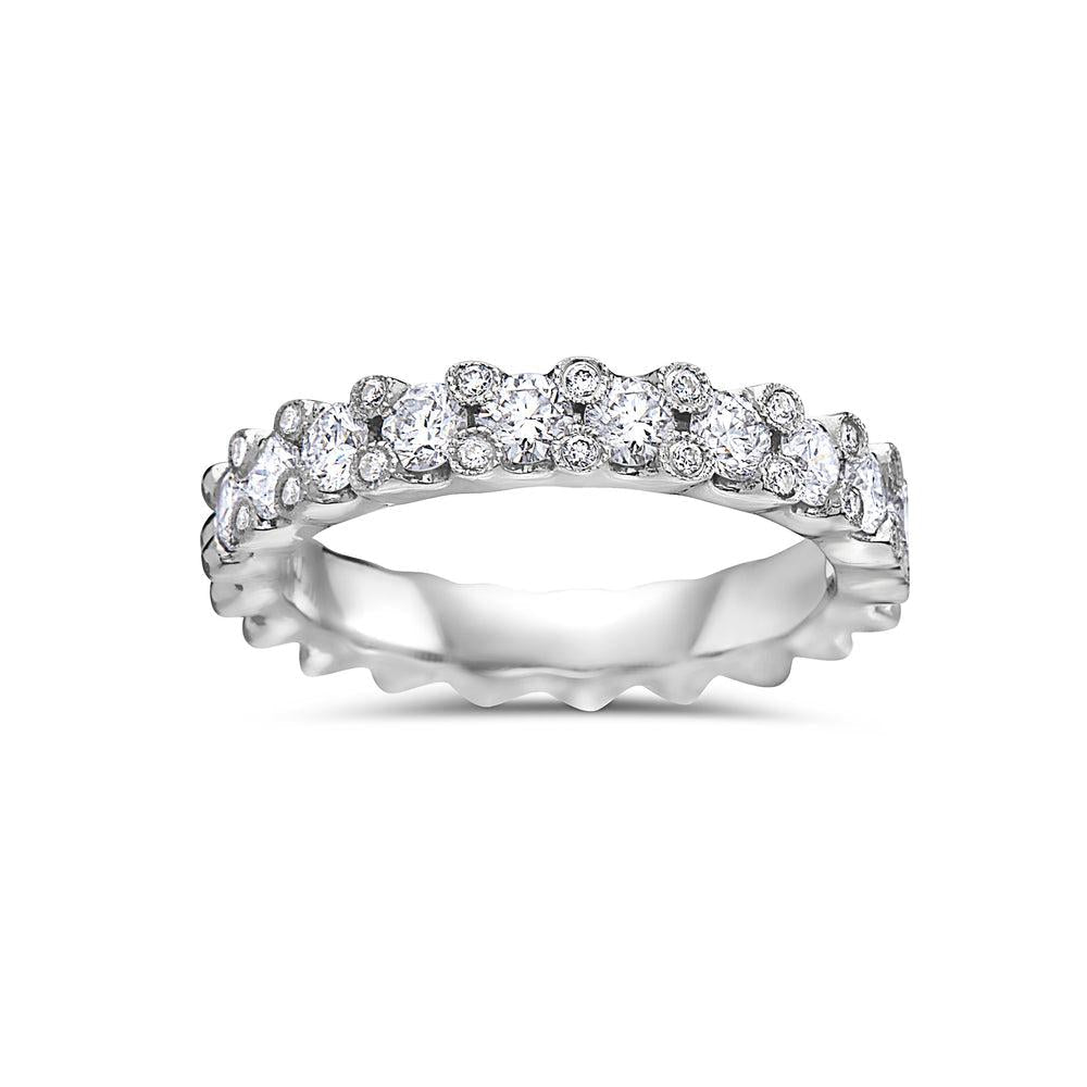 Ladies 18K white gold eternity wedding ring, with round cut diamonds.