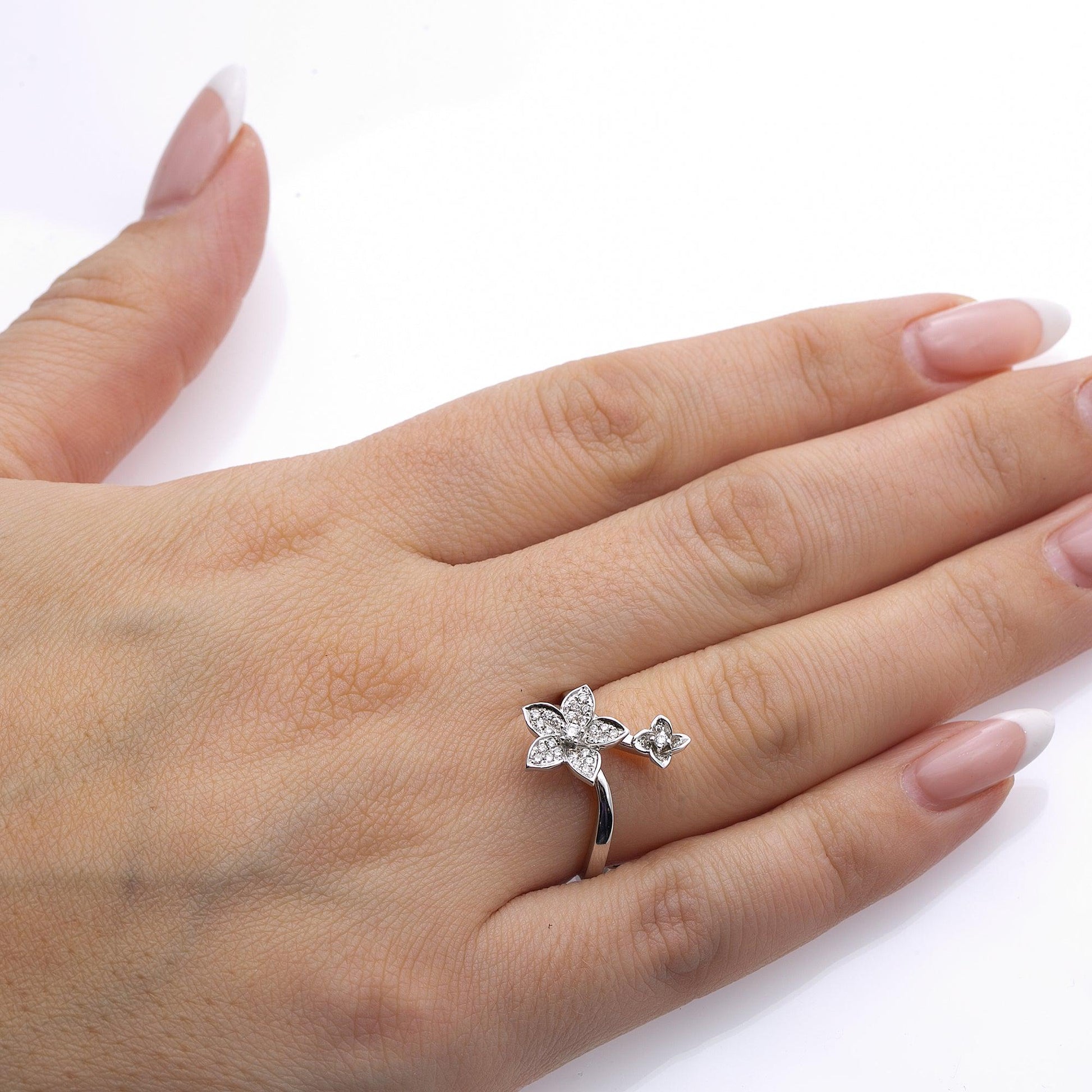 Ladies 18k white gold right hand ring, with flower in center with round cut diamonds inside the flower