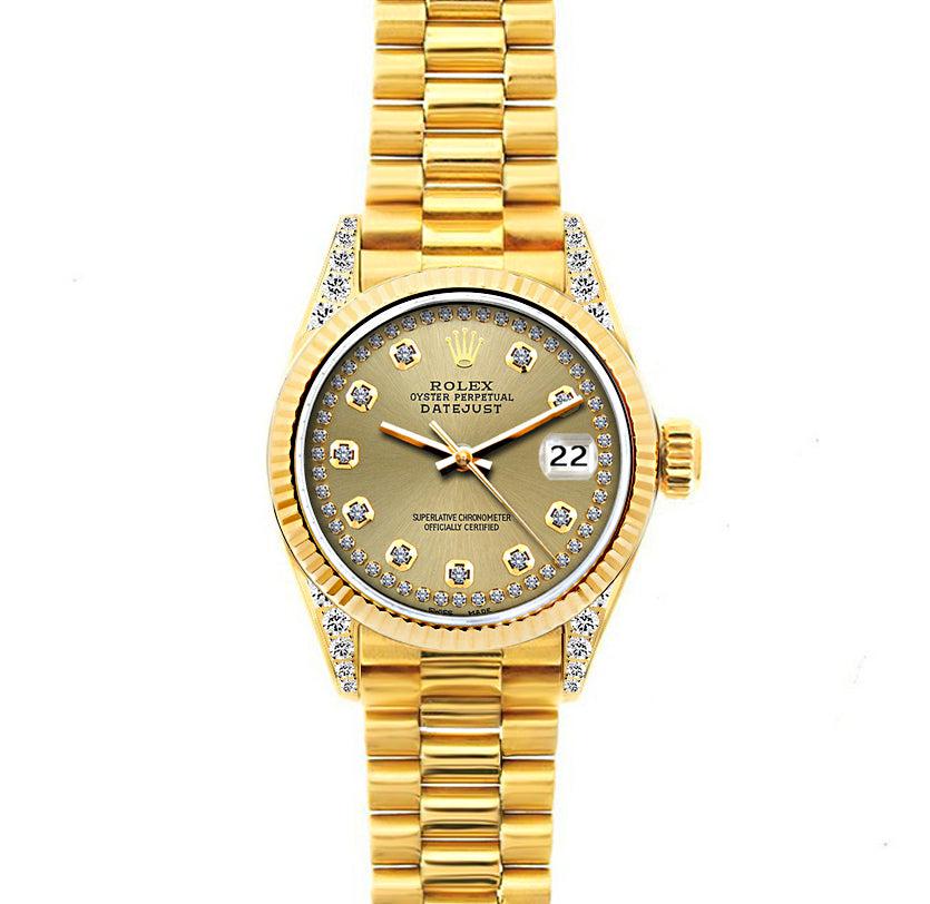 18k Yellow Gold Rolex Datejust Diamond Watch, 26mm, President Bracelet Champagne Dial w/ Diamond Lugs