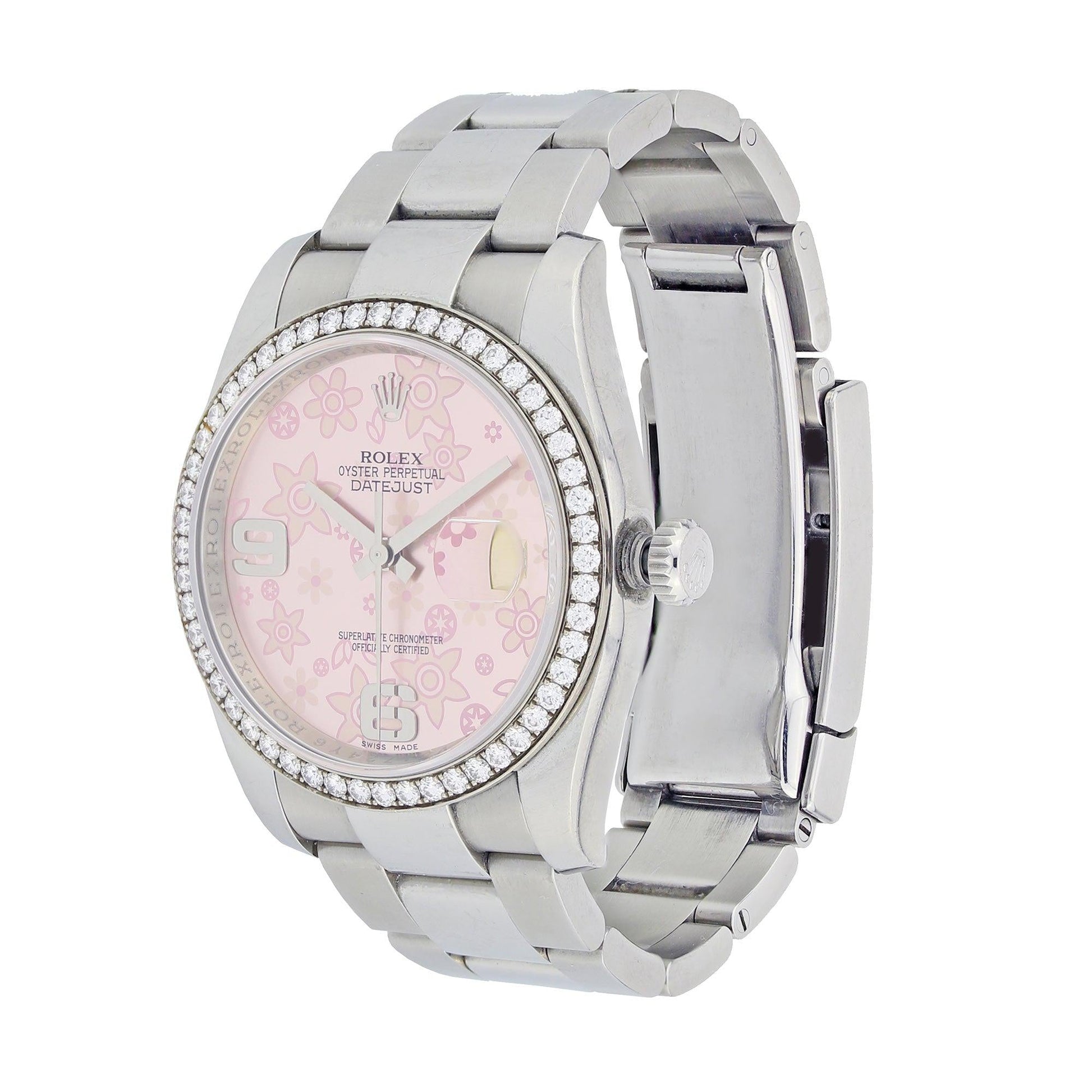 Rolex 36MM Datejust Stainless Steel Watch with Diamonds. 36mm stainless steel case, with a stainless steel screw down crown. 18K white gold bezel set with 52 brilliant-cut diamonds. Sapphire crystal. Pink dial with Rolex floral design, with Arabic numerals, and date display. Automatic movement. Stainless steel Oyster bracelet.