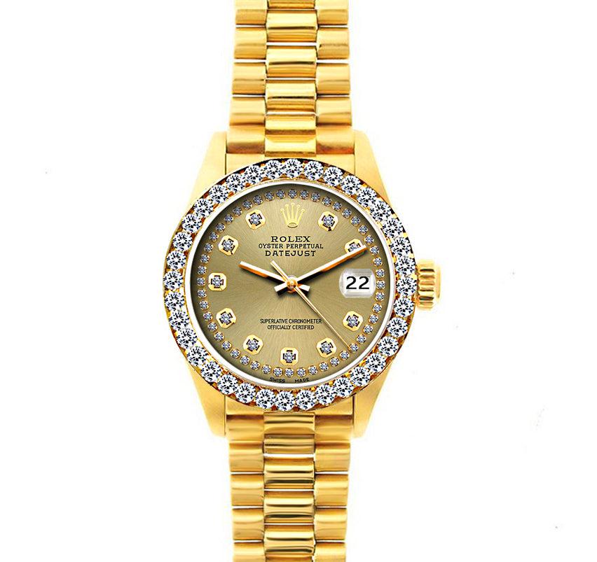 18k Yellow Gold Rolex Datejust Diamond Watch, 26mm, President Bracelet Champagne Dial w/Diamond Bezel