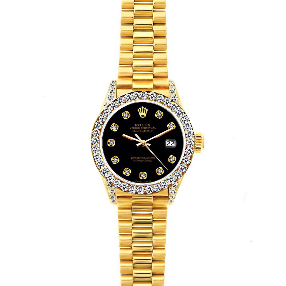 18k Yellow Gold Rolex Datejust Diamond Watch, 26mm, President Bracelet Black Dial w/ Diamond Bezel and Lugs