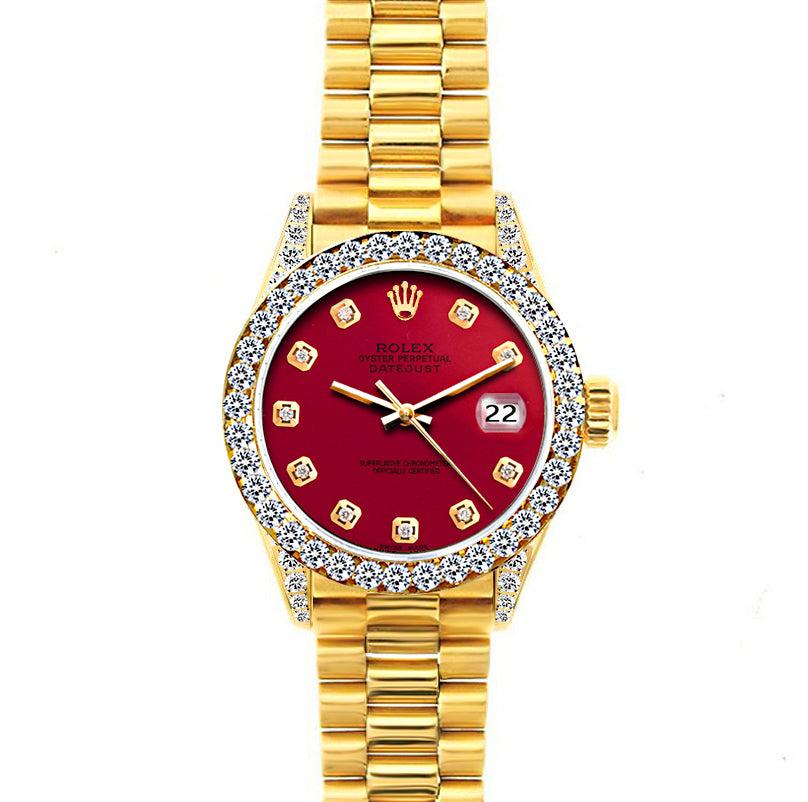18k Yellow Gold Rolex Datejust Diamond Watch, 26mm, President Bracelet Cardinal w/ Diamond Bezel and Lugs
