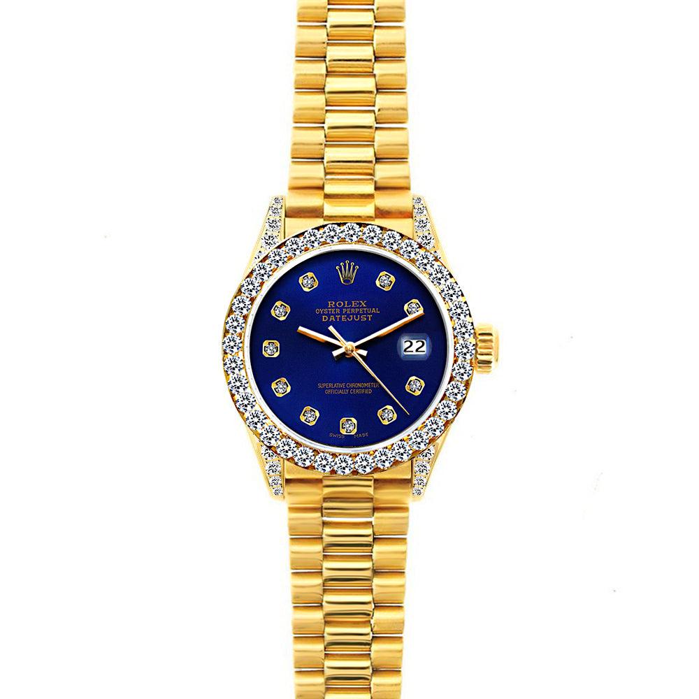 18k Yellow Gold Rolex Datejust Diamond Watch, 26mm, President Bracelet Ultramarine w/ Diamond Bezel and Lugs