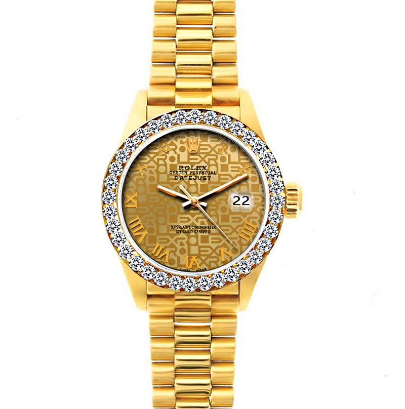 18k Yellow Gold Rolex Datejust Diamond Watch, 26mm, President Bracelet Champagne Dial w/ Diamond Bezel