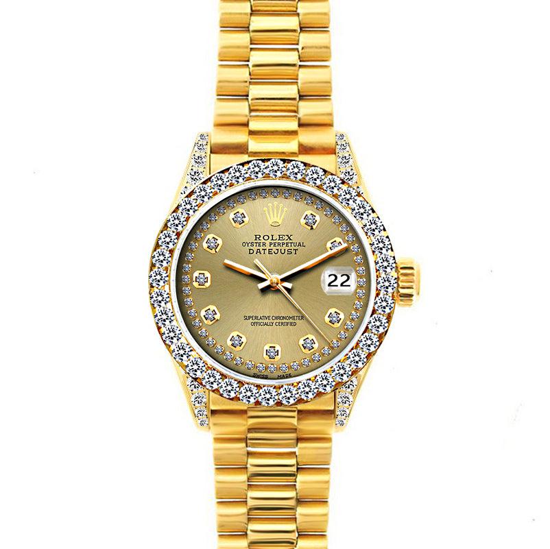18k Yellow Gold Rolex Datejust Diamond Watch, 26mm, President Bracelet Champagne Dial w/ Diamond Bezel and Lugs