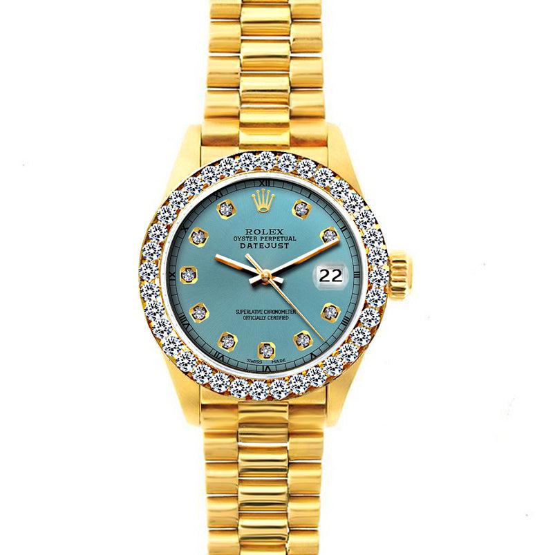 18k Yellow Gold Rolex Datejust Diamond Watch, 26mm, President Bracelet Ice Blue Dial w/ Diamond Bezel
