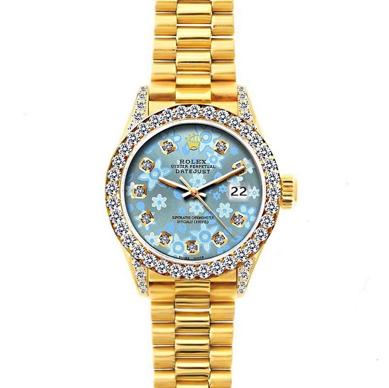 18k Yellow Gold Rolex Datejust Diamond Watch, 26mm, President Bracelet Ice Blue Flower Dial w/ Diamond Bezel and Lugs