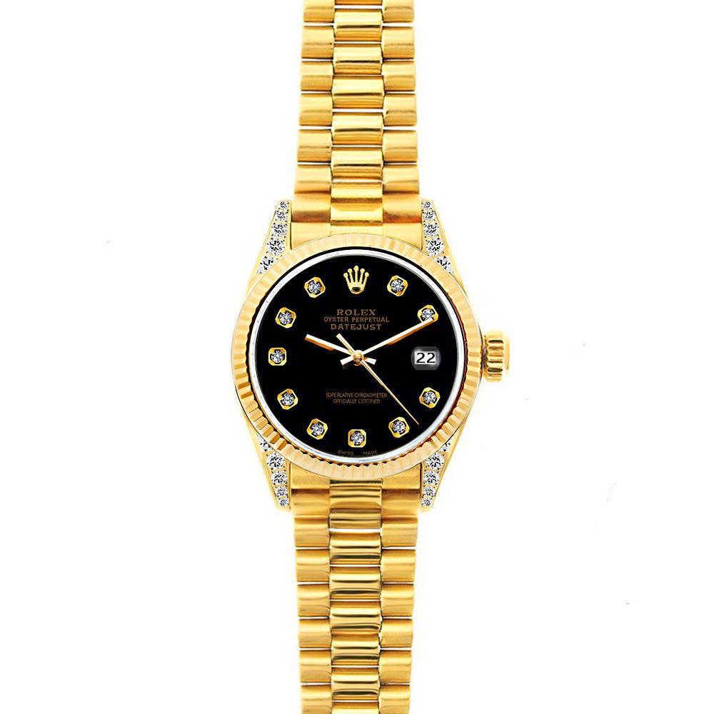 18k Yellow Gold Rolex Datejust Diamond Watch, 26mm, President Bracelet Black Dial w/ Diamond Lugs