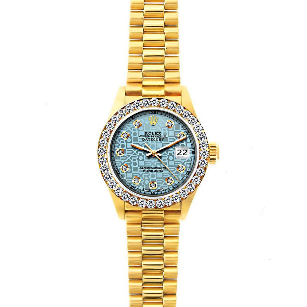 18k Yellow Gold Rolex Datejust Diamond Watch, 26mm, President Bracelet Ice Blue Rolex Dial w/ Diamond Bezel