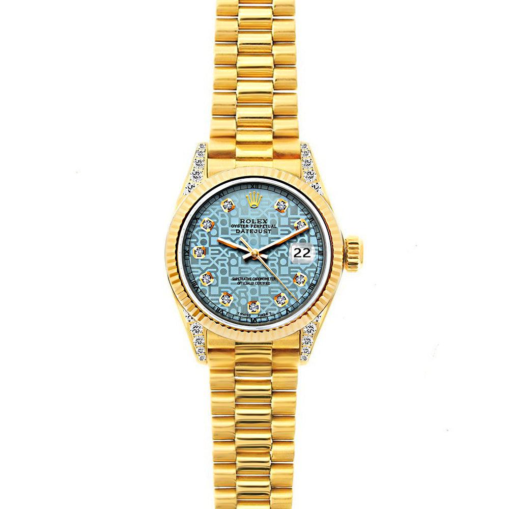 18k Yellow Gold Rolex Datejust Diamond Watch, 26mm, President Bracelet Ice Blue Rolex Dial w/ Diamond Lugs