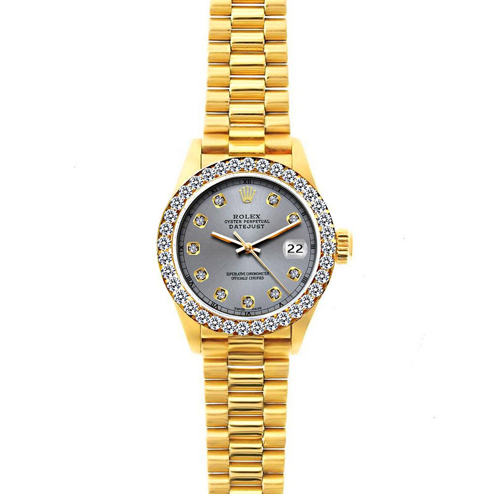 18k Yellow Gold Rolex Datejust Diamond Watch, 26mm, President Bracelet Gray Dial w/ Diamond Bezel
