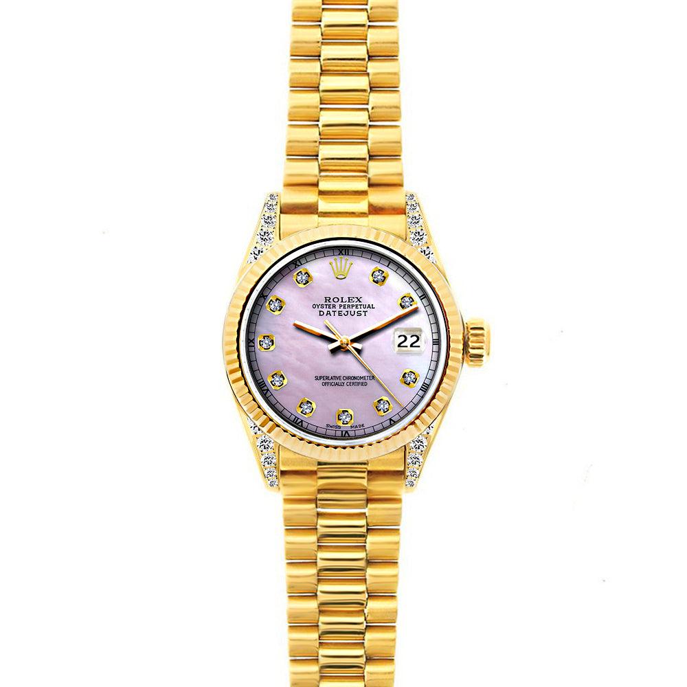 18k Yellow Gold Rolex Datejust Diamond Watch, 26mm, President Bracelet Pink Dial w/ Diamond Lugs