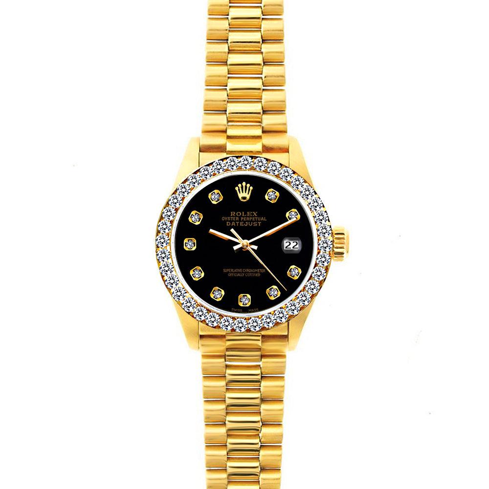 18k Yellow Gold Rolex Datejust Diamond Watch, 26mm, President Bracelet Black Dial w/ Diamond Bezel