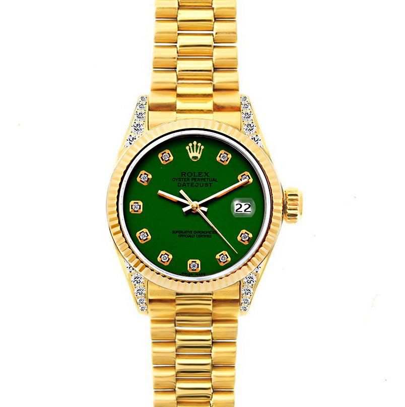 18k Yellow Gold Rolex Datejust Diamond Watch, 26mm, President Bracelet Myrtle Dial w/ Diamond Lugs