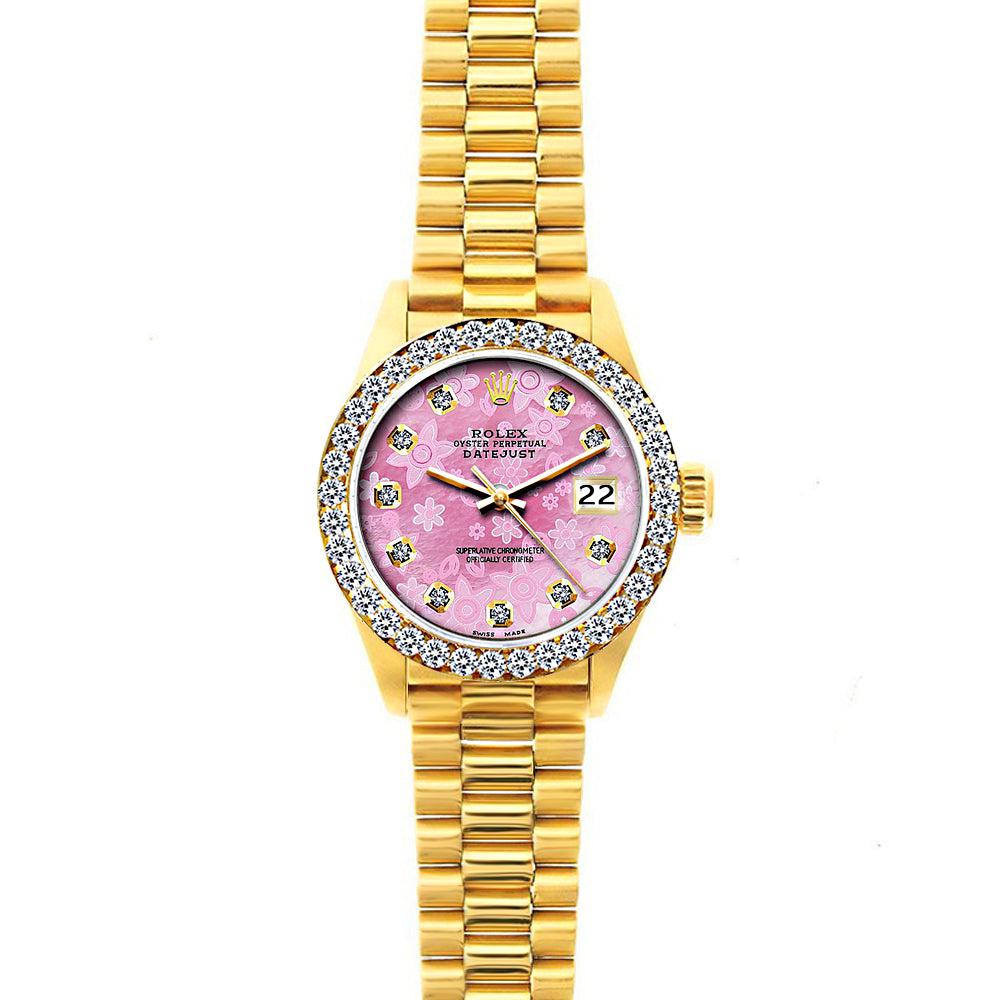 18k Yellow Gold Rolex Datejust Diamond Watch, 26mm, President Bracelet Pink Flower Dial w/ Diamond Bezel