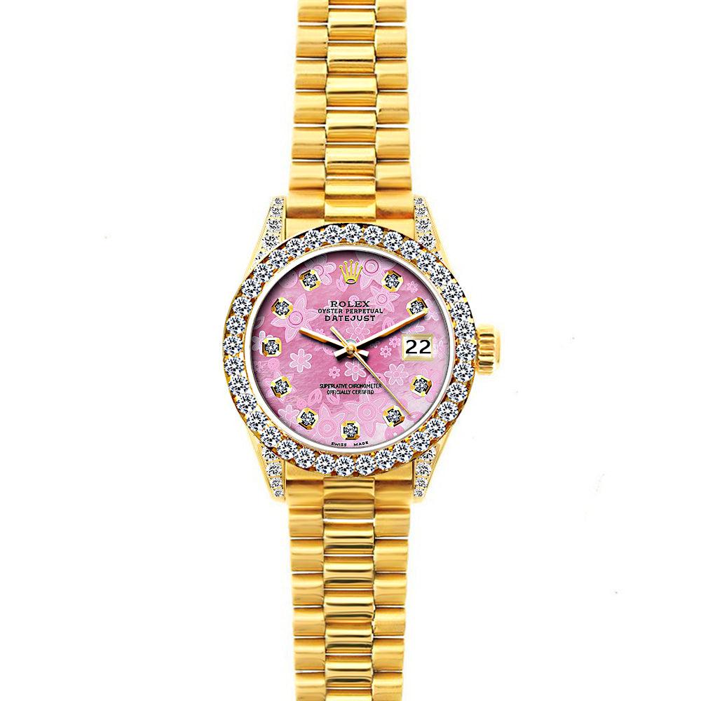 18k Yellow Gold Rolex Datejust Diamond Watch, 26mm, President Bracelet Pink Flower Dial w/ Diamond Bezel and Lugs