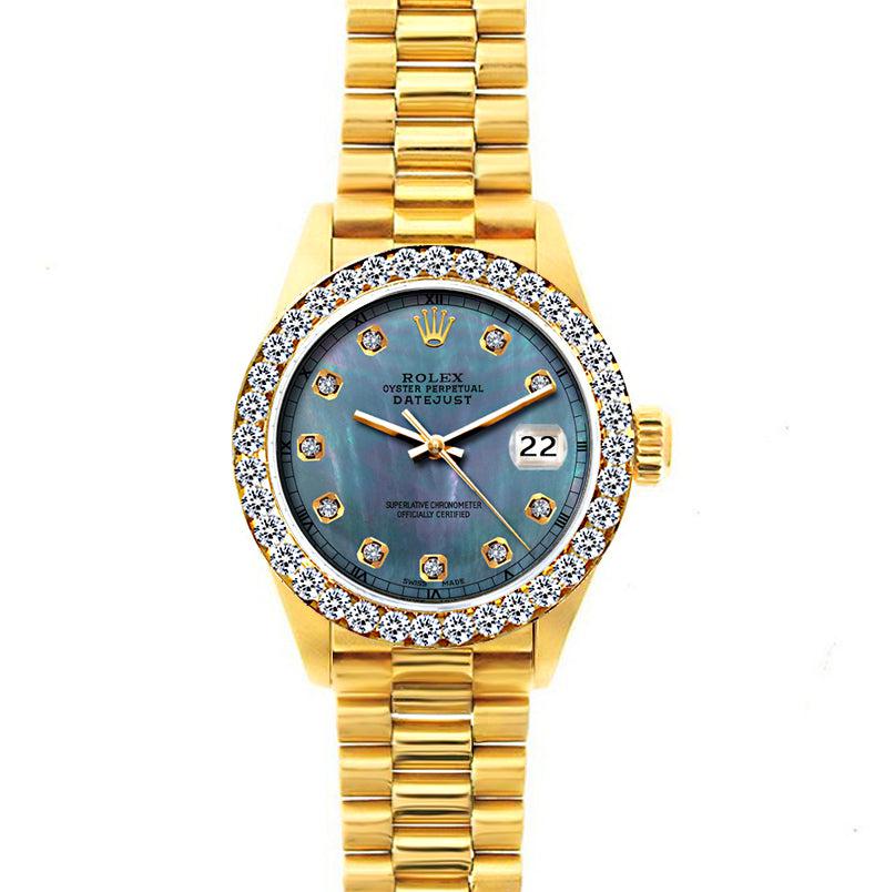 18k Yellow Gold Rolex Datejust Diamond Watch, 26mm, President Bracelet Pearl Blue Dial w/ Diamond Bezel