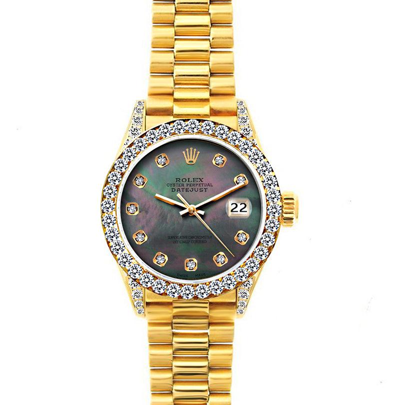 18k Yellow Gold Rolex Datejust Diamond Watch, 26mm, President Bracelet Black Mother of Pearl Dial w/ Diamond Bezel and Lugs