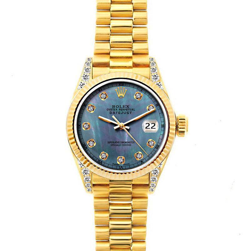 18k Yellow Gold Rolex Datejust Diamond Watch, 26mm, President Bracelet Black Mother of Pearl Dial w/ Diamond Lugs