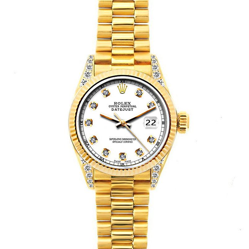 18k Yellow Gold Rolex Datejust Diamond Watch, 26mm, President Bracelet White Dial w/ Diamond Lugs