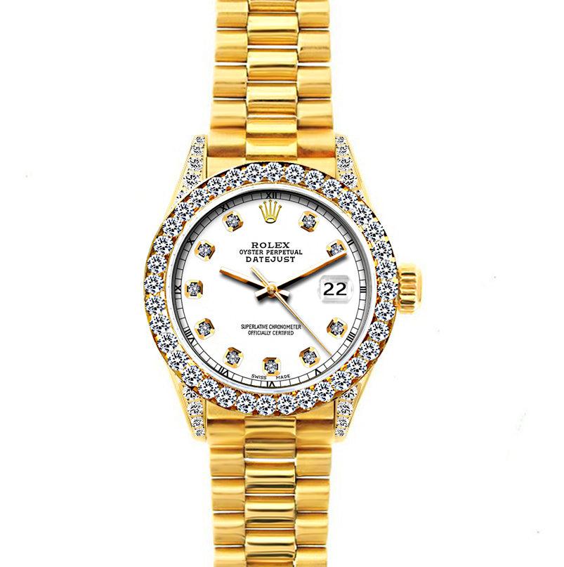 18k Yellow Gold Rolex Datejust Diamond Watch, 26mm, President Bracelet White w/ Diamond Bezel and Lugs