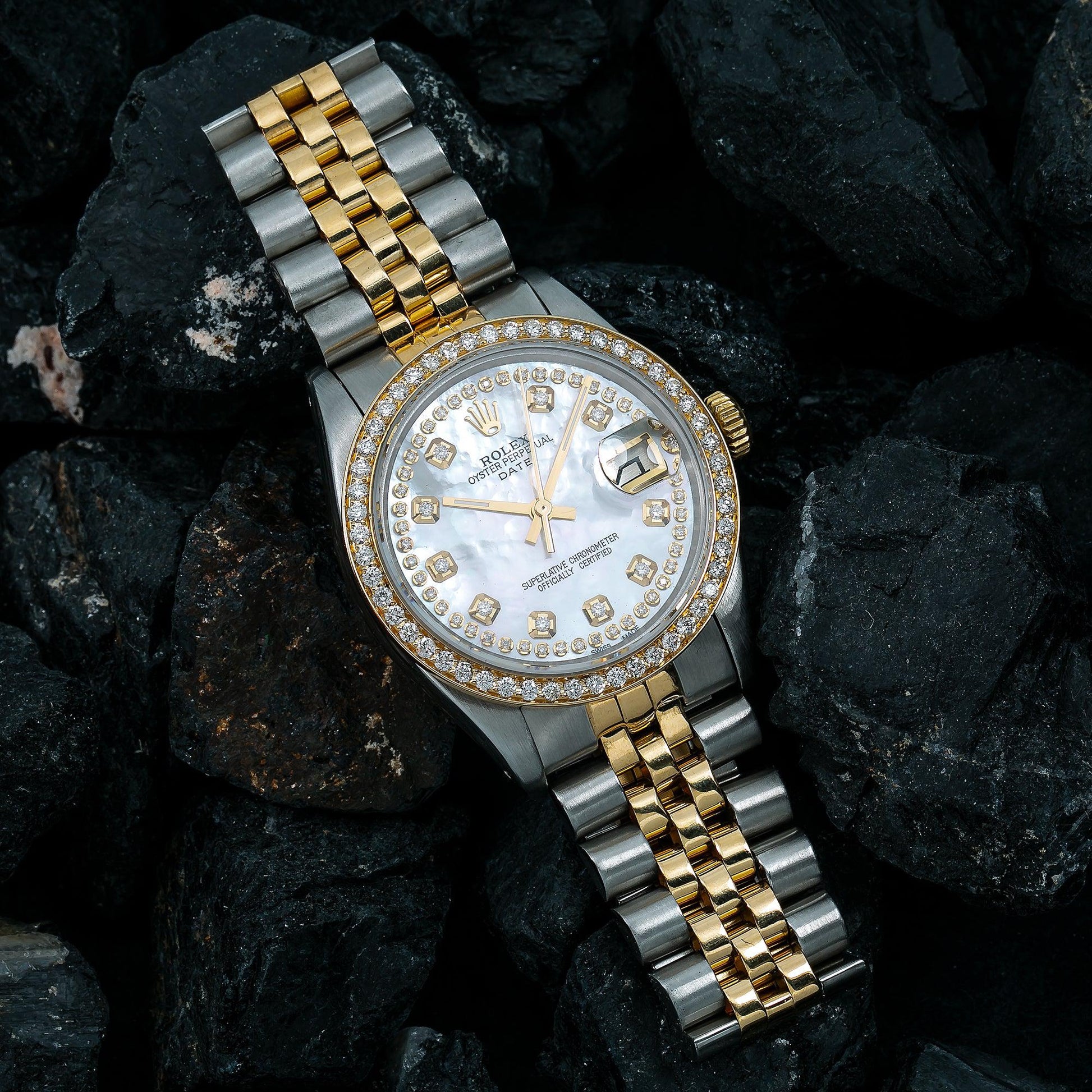 Rolex Oyster Perpetual Diamond Watch, Date 1500 34mm, Mother of Pearl Diamond Dial With Two Tone Oyster Bracelet