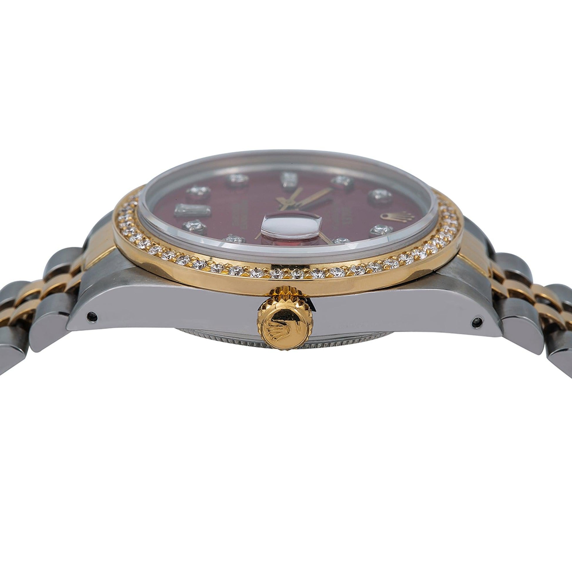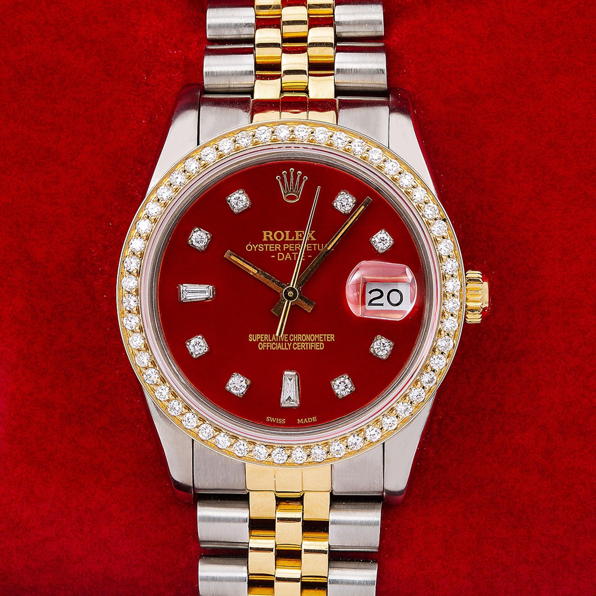 Rolex Oyster Perpetual Diamond Watch, Date 15053 34mm, Red Diamond Dial With Two Tone Jubilee Bracelet